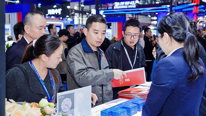 河南卫华总裁冯军(左一)为参展嘉宾介绍卫华概况
